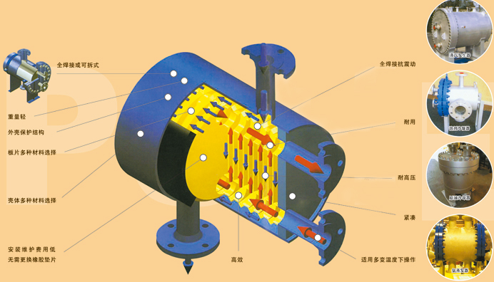 獨(dú)特的板片間熔合全焊結(jié)構(gòu)和壓力容器保護(hù)性外殼,使其具有耐高溫、耐高壓性能,能夠勝任絕大多數(shù)換熱操作。